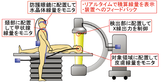 X線透視を伴う血管内治療(IVR; Interventional Radiology)では、長時間にわたるX線透視を行われる。心筋梗塞などでは繰り返し手術を受ける可能性があるため、潰瘍などの重篤な皮膚障害が発生する可能性がある。従来の線量計は、透視に映るものや検出部分の体積が大きいなどの問題があった。特に、エネルギー依存性が測定の精度に影響を及ぼすため、小型でエネルギー依存性が少なく、かつ透視に映らない線量計は存在しなかったが、本研究にて開発を行ったSOF線量計は、センサー部分は生体と密度が近いためにX線透視下で全く映らないという特徴がある。また、現時点で60~150kVの範囲において感度変化5%以内を達成しているが、さらに感度変化を小さくするために、企業と共同でセンサー物質の改良を進めている。